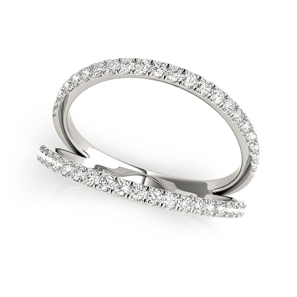 Utterly stunning in 14k white gold, this ring features pave set diamonds. A delightful beauty with a fashionable dual band design.